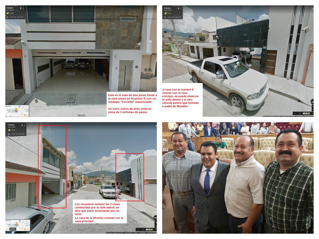 Son varios inmuebles de lo cual muchos son usados como casas de seguridad da parte del crimen organizado.En particular un inmueble en la calle 1 de Mayo al numero 36 adquirido en el 2009 y otro inmueble enfrente conectados a través de un túnel para favor la huida de miembros del crimen organizado. Los inmuebles cuentan con cocheras por mas de 10 vehículos. El primer inmueble tiene mas de 300 metro cuadrados y varias salidas a parte del túnel que lo conecta a la casa en frente. Los inmuebles están a nombre de su mama que de ser una mujer que vivía leyendo cartas ahorita se ha vuelto una de las personas mas ricas del Estado con un departamento de 12 millones de pesos en el desarrollo Acqua Flamingos en Nuevo Vallarta y varias otras propiedades en Botadero y Tepic. Es de dominio publico que el Mundito compró en Agosto 2017 29 vehículos nuevos a la agencias de Jotoñio Echevarria.