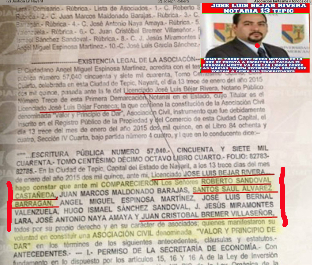 La empresa A.C A.C. Valor y principios del da son varios socios incluso Hugo Ismael Sanchez Sandoval sobrino de Roberto ejecutado hace 4 años en Tepic en una camioneta llena de dinero.Sandoval y los mafiosos de los Béjar van a tener que explicar muchas cosas respecto a Juan Cristóbal Bremer Villaseñor socio en la A.C. Valor y principios del dar junto a Juan Marcos Maldonado Barajas, Santos Saúl Álvarez Barragán,(alias el Canelo), Ángel Miguel Espinoza Martínez, José Luis Bernal Valenzuela, Jesús Miramontes Lara, José Antonio Naya Amaya como da Escritura 57040 del 13 Enero 2015 llevada a cabo en la Notaria 13 da José Luis Béjar Rivera hijo de Jose Luis Bejar Fonseca.