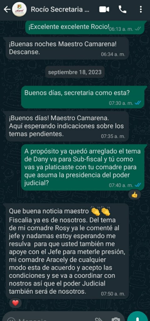 Las conversaciones de WhatsApp a las que hemos tenido acceso revelan algo sumamente preocupante: la existencia de una mafia liderada por el chilango Camarena, la cual está manipulando el sistema judicial para nombrar a funcionarios afines a ellos. Esto es particularmente grave, ya que socava la independencia y la transparencia del proceso de nombramiento de funcionarios públicos.