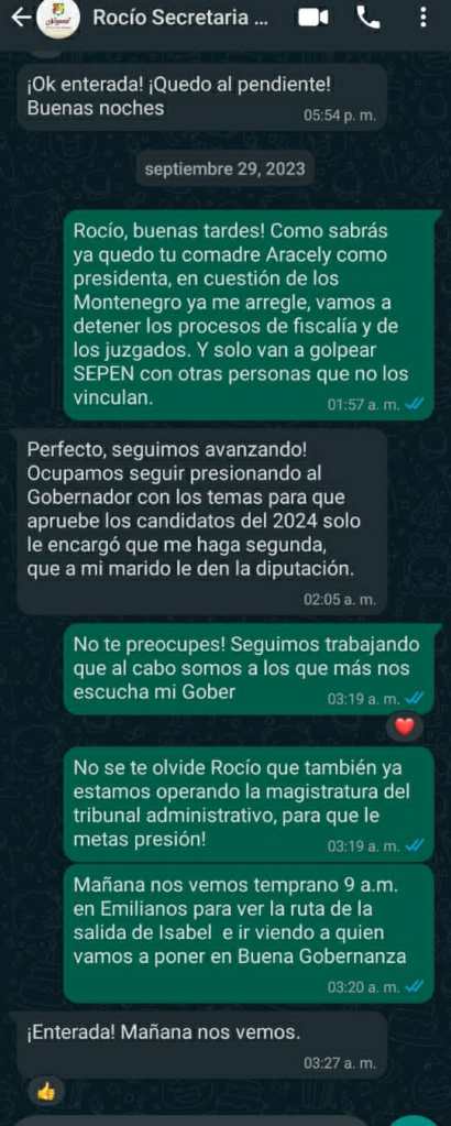 En particular, en una conversación de WhatsApp Rocío González le pide a Araceli Ávalos que apoye la candidatura a diputado federal de su esposo, lo que sugiere un posible tráfico de influencias y una utilización indebida de los cargos públicos por parte de estos funcionarios.