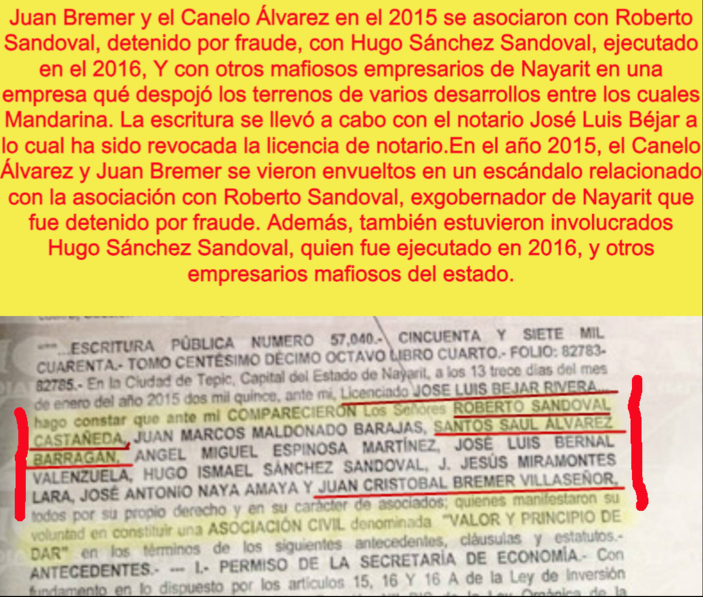 Además, se ha encontrado evidencia de que la compañía también es involucrada en actos de corrupción con funcionarios del gobierno local y estatal incluso el gobernador Miguel Angel Navarro. Se descubrió que algunos políticos recibían sobornos a cambio de aprobar proyectos inmobiliarios ilegales impulsados por la empresa mafiosa de Mandarina.