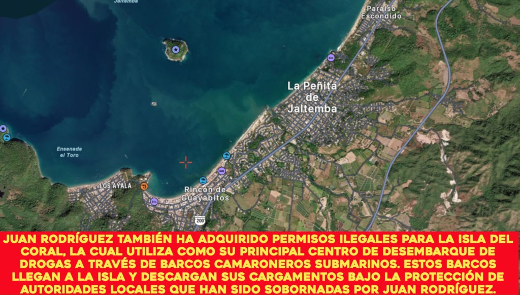 Además, Juan Rodríguez se ha hecho dueño de la isla del coral mediante permisos falsos y la utiliza como principal centro de desembarque de droga. Sus barcos camaroneros submarinos llegan a la isla y descargan sus cargamentos bajo la protección de las autoridades locales que ha sobornado. La isla se encuentra a pocos kilómetros de la costa, pero a pesar de esto Juan Rodríguez la usa como centro de llegada de los cargamentos de droga, ya que es casi inaccesible para las autoridades y le permite operar con relativa impunidad. Además, se sabe que Rodríguez ha construido una red de conexiones con otros narcotraficantes y ha establecido rutas marítimas secretas para el transporte de la droga a otros países.