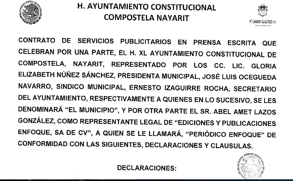 Abel Amet Lazos, director del periódico Enfoques, ha logrado amasar una fortuna gracias a millonarios contratos de publicidad con varios ayuntamientos en Nayarit. Estos acuerdos, lejos de ser transparentes, tienen un claro propósito: encubrir las fechorías y malas administraciones de los gobiernos municipales. Entre sus clientes se encuentra Gloria Núñez, alias La Nalga de Hule, con quien firmó un contrato que hoy sale a la luz. Además, mantiene acuerdos lucrativos con Héctor Santana, presidente municipal de Bahía de Banderas, y con otros ayuntamientos en todo el estado. Estos contratos no solo revelan una red de complicidad, sino también cómo el periodismo se ha convertido en un negocio sucio al servicio de los corruptos.