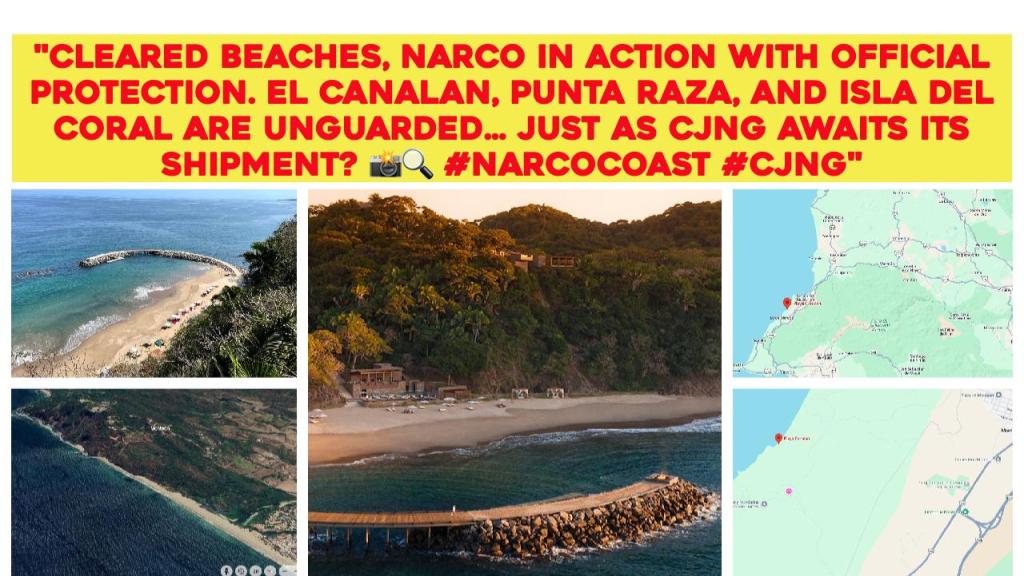 El Mencho, from his hideout in Mandarina, orchestrates the landing of 25–30 tons of drugs via the southern Pacific. Taking advantage of the heavy tourist activity as the perfect cover, his speedboats blend in with recreational vessels to move the shipment to Las Cuevas beach on Isla del Coral during the early morning hours. From there, the goods are transferred in lightning-fast operations to El Canalan beach, completing the narco route.