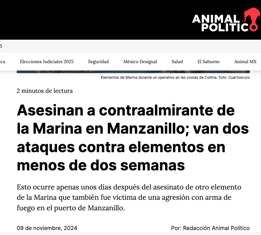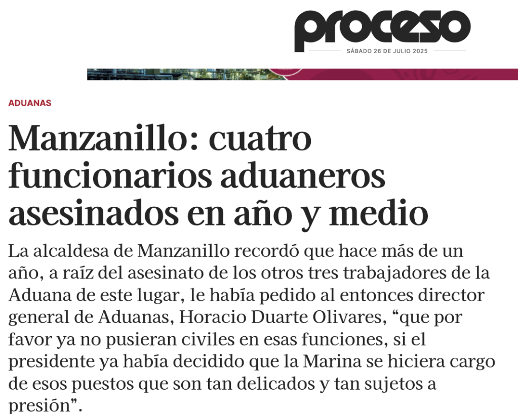 *»El asesinato del contralmirante de la SEMAR, Fernando Guerrero Alcántara (noviembre 2024), y el homicidio de Sergio Martínez Covarrubias, exadministrador de Aduanas (mayo 2023), son solo dos casos confirmados de una purga sistemática: el CJNG elimina a cualquier funcionario que se niegue a colaborar con su control absoluto del puerto de Manzanillo. Fuentes internas revelan que los crímenes siguen un mismo patrón: